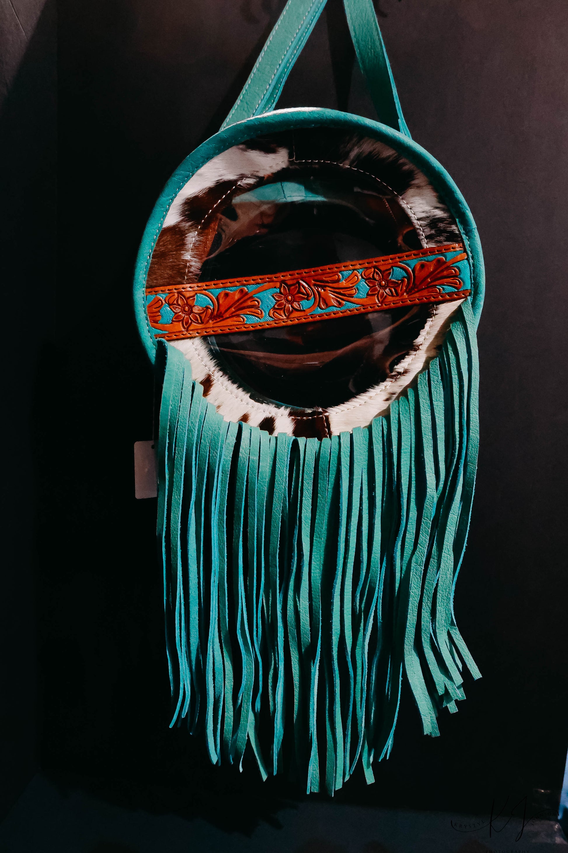 This gorgeous canteen bag is perfect for venues that require clear purses! It is accented with tooled leather, cowhide, and suede fringe.