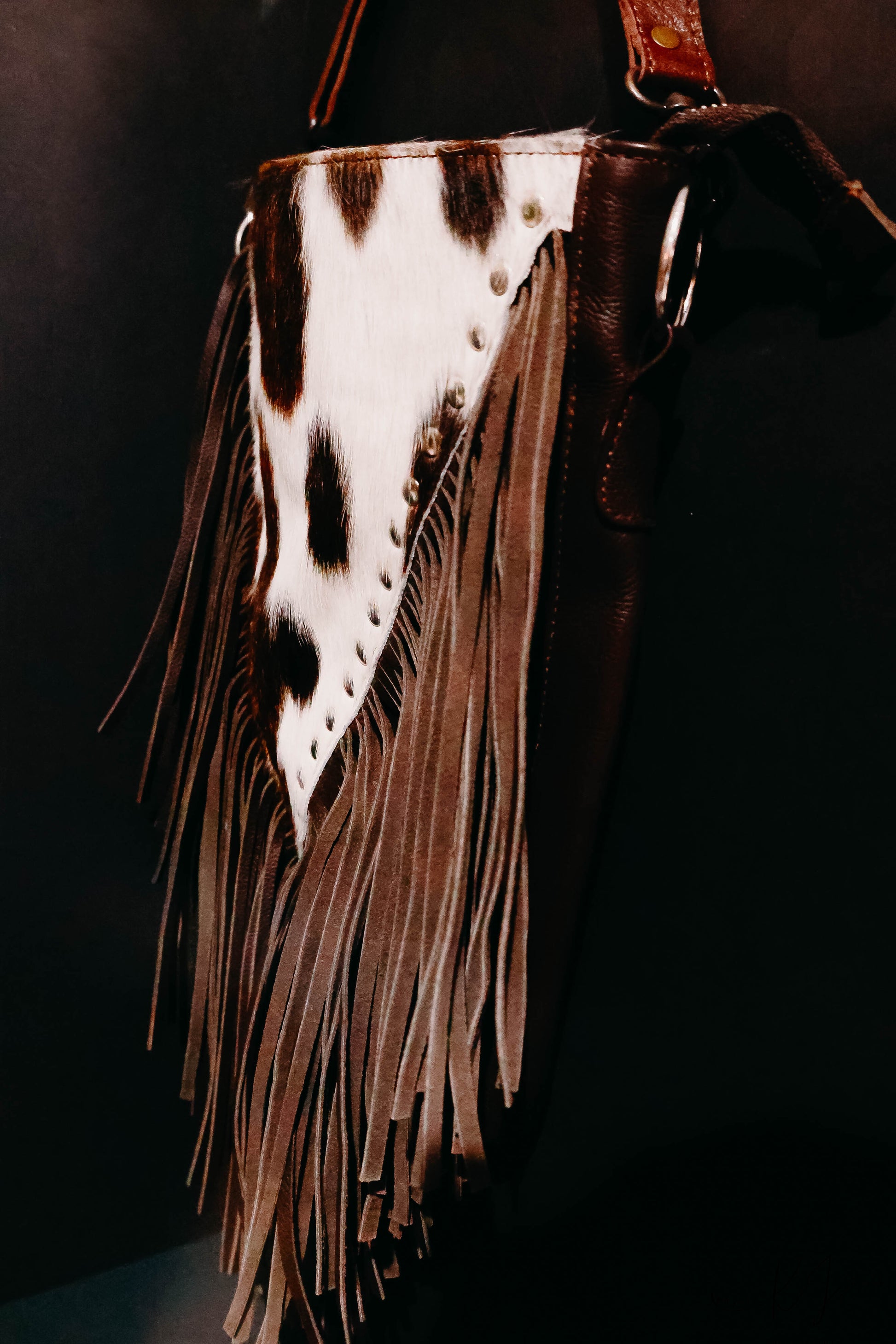 Make a statement with this large genuine leather purse, perfect for wearing cross-body or over the shoulder. It flaunts fun hair-on-hide accents, playful fringe, and edgy studs that add just the right amount of wow to your outfit. Spacious and stylish, it’s your new favorite sidekick for every adventure!