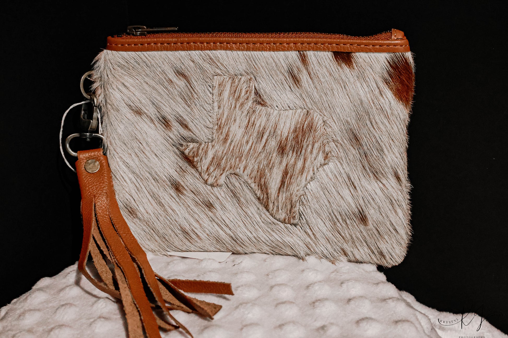 This large zipper coin purse features genuine hair-on-hide leather crafted with a distinctive Texas state design, highlighting regional pride and style. Equipped with a convenient tassel and wristlet attachment, it offers secure closure and easy portability. Ideal for organizing coins and small essentials, this purse combines durability with a refined, expert finish.